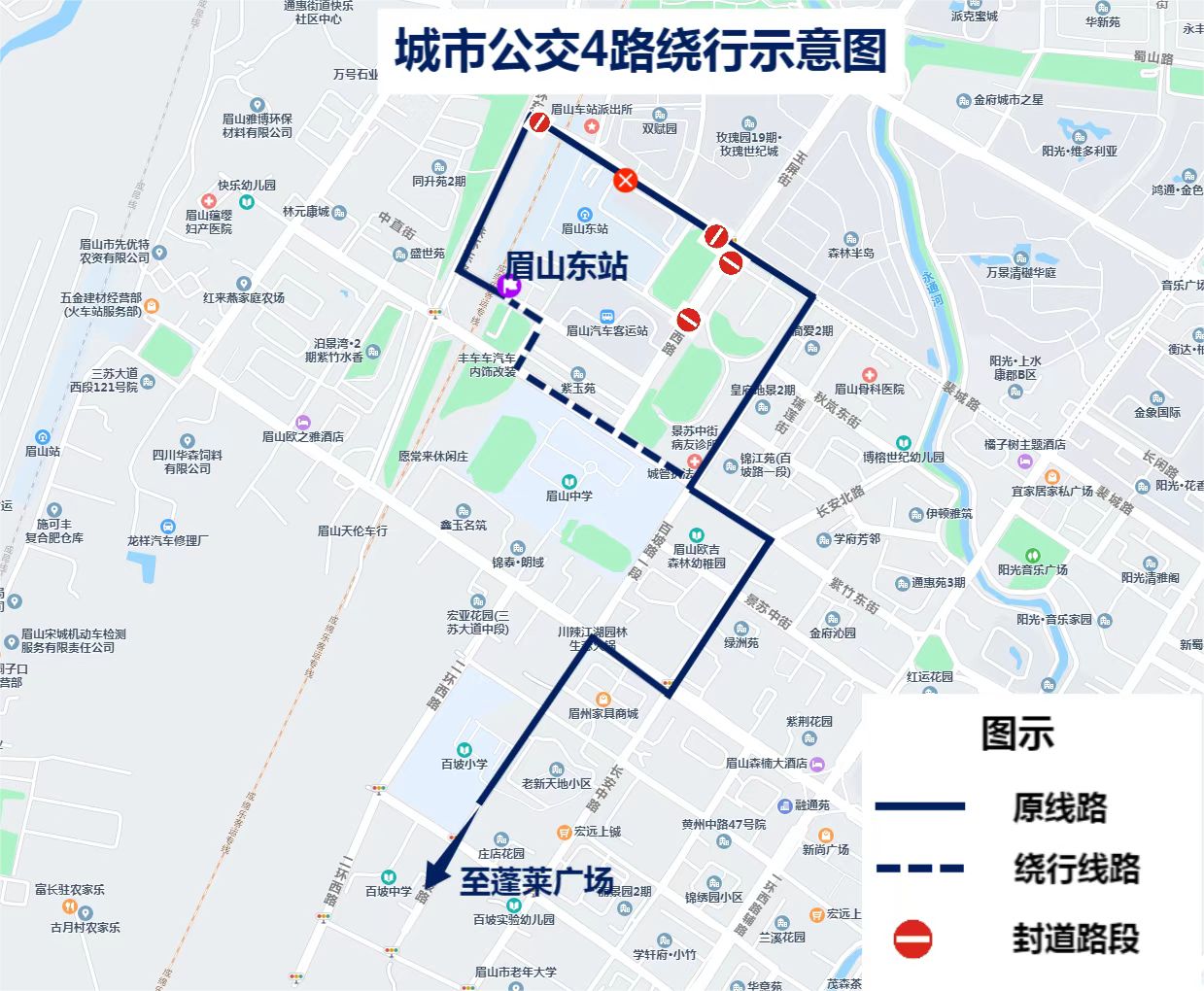 (一)公交4路:眉山東站出發(fā),繞行紫竹中街后原線路運行(往返繞行)。